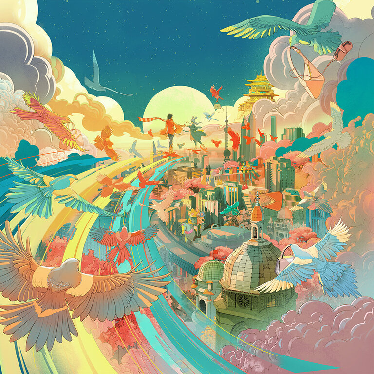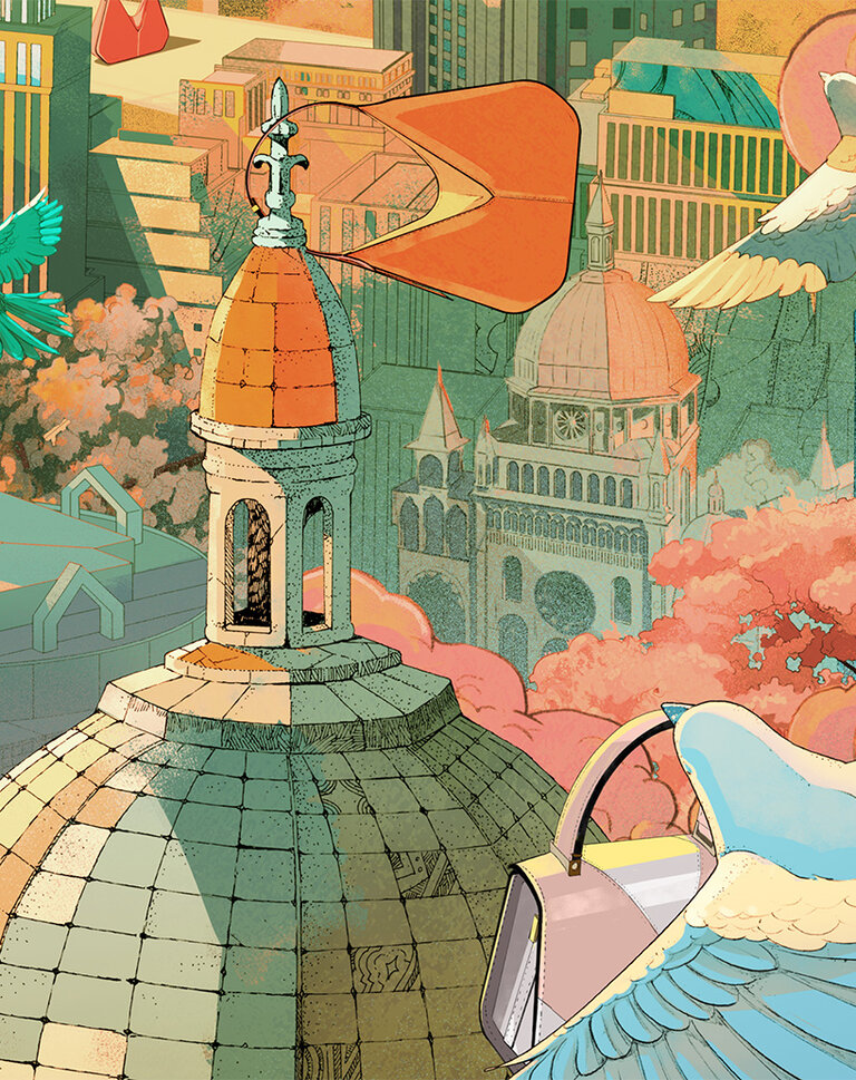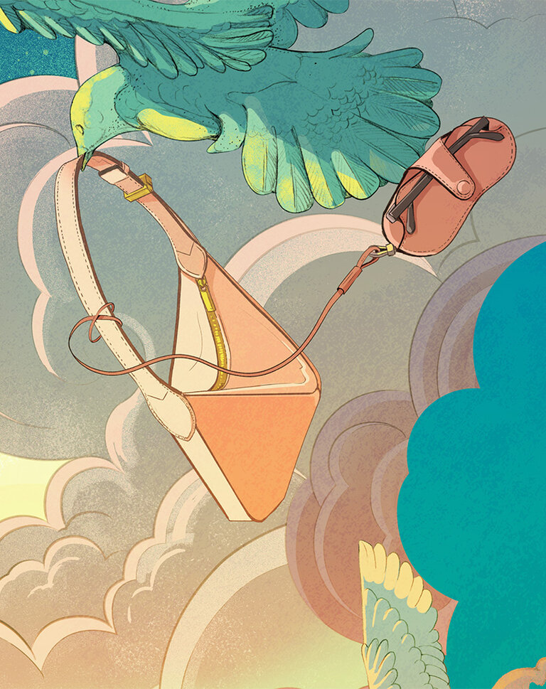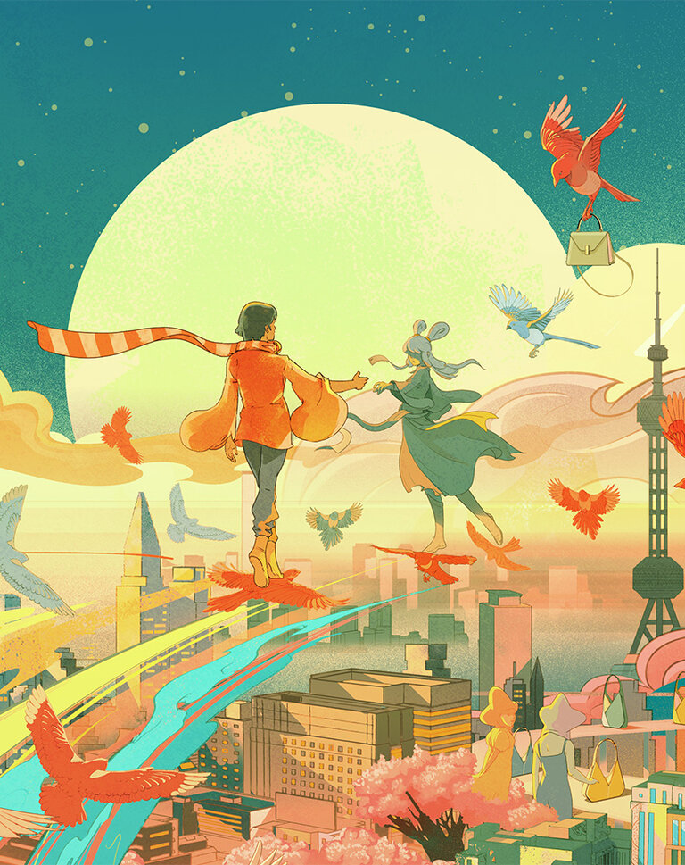 Valextra celebrates the Qixi Festival with the depiction of the romantic legend of Zhinü and Niulang whose love was forbidden, leading to their banishment to opposite sides of a heavenly river symbolising the Milky Way. Once a year, on the seventh day of the seventh lunar month, a flock of magpies would form a bridge to reunite the lovers for a single day, Chinese Valentine’s Day, a scene that forms the inspiration for our illustrative series.