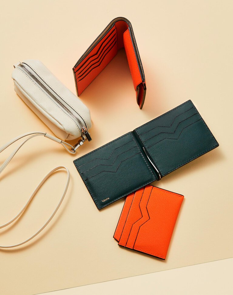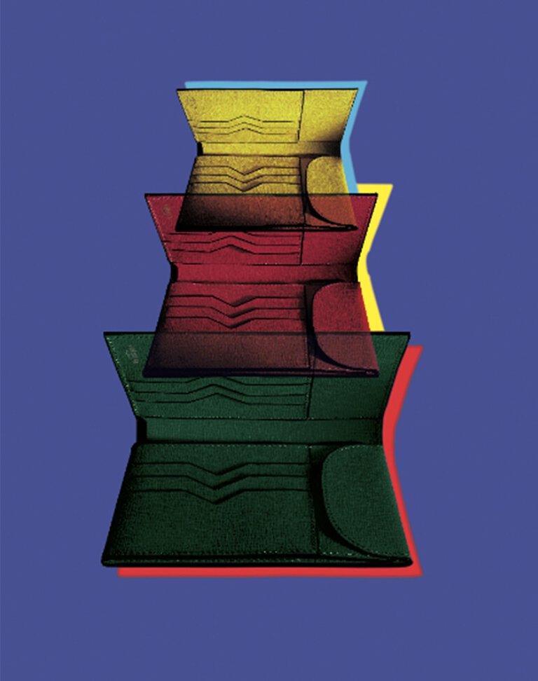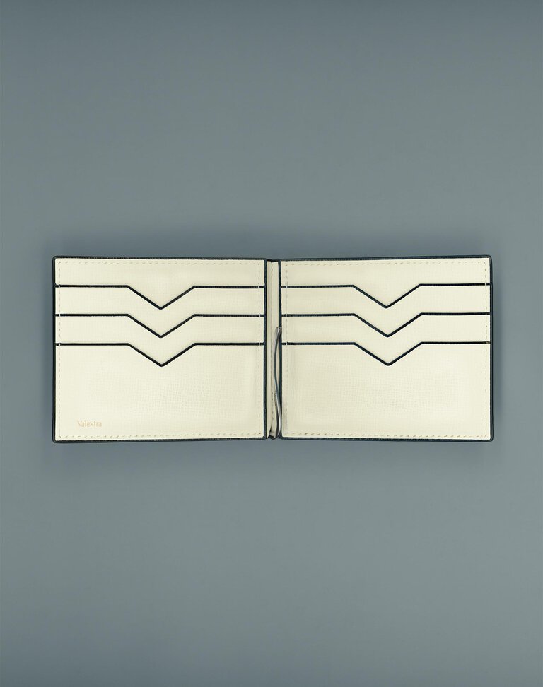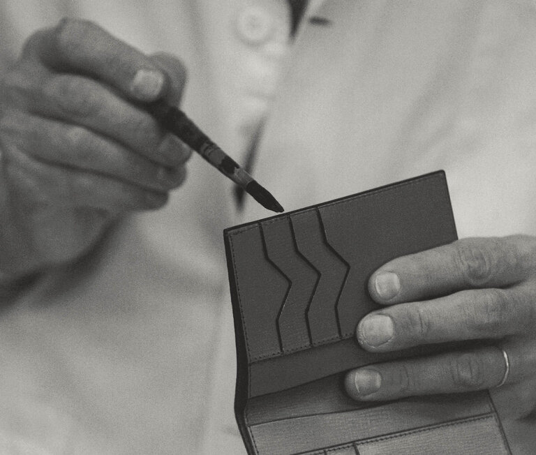 A graphic statement, revealed inside a money clip wallet. This technique, known as Inchiostro, is a way of finishing leather edges with a specially formulated ink to make them both durable and beautiful. In this process there is little room for error, which means it must be completed entirely by hand. The end result - an array of vibrating black lines- is both a celebration of form and a distinctive signature.