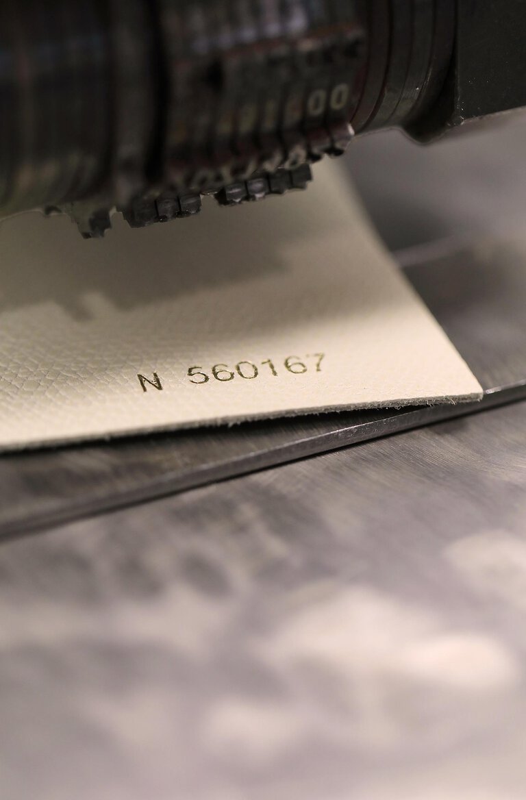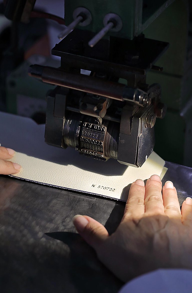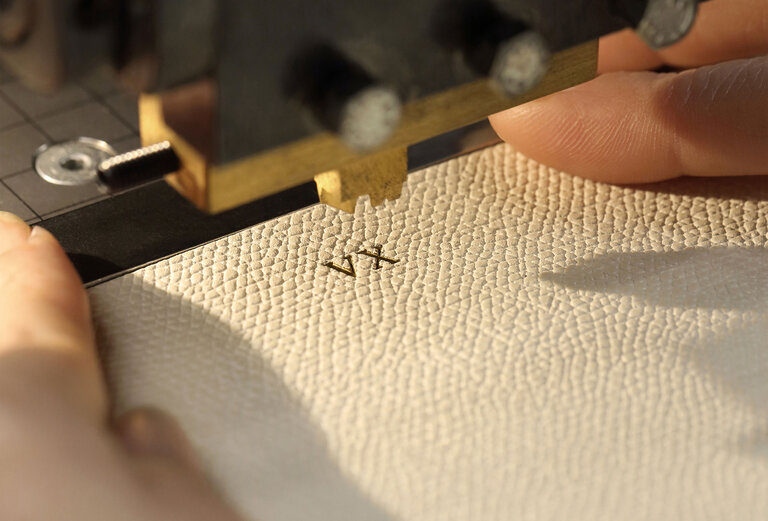 A secret code. Or, rather, the evidence remaining. This foil is used in the Valextra workshop to stamp a unique number on each product. A closer look reveals the numbers are progressive, meaning that each one is not just connected to a specific time and place, but is a part of an ongoing sequence - a continuum of craft, ingenuity and precision.