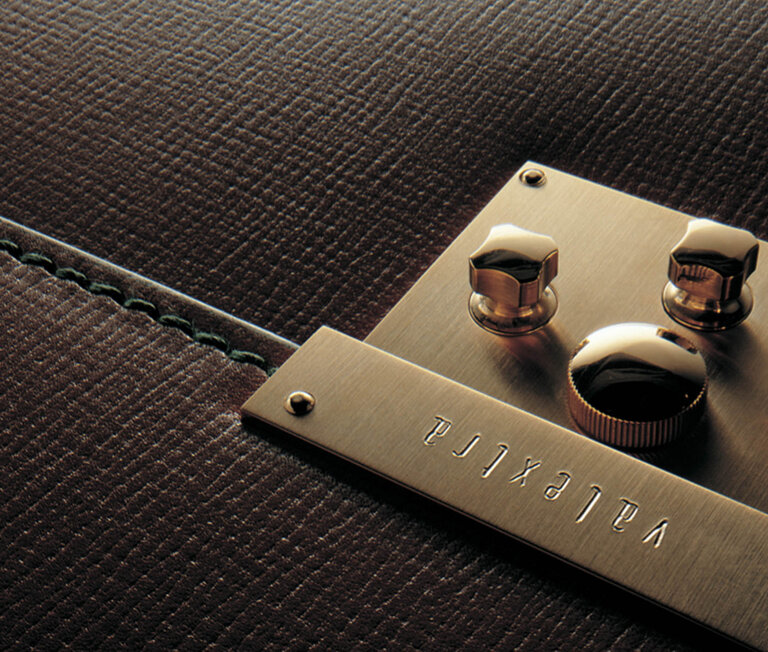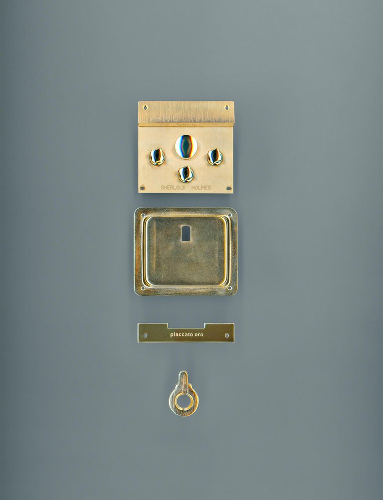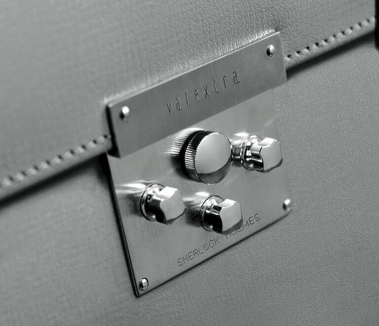 Here is a mystery: an intricate lock, its surface engraved with the name "Sherlock Holmes". With this ingenious design, using the three dials below the central button, a user can secure their luggage with a personal combination. This is a piece that encapsulates an artful approach to engineering beauty, impressive not just for its elegant form but also for its complex mechanism, which is set to the user's unique preference by inserting the key, visible beneath.