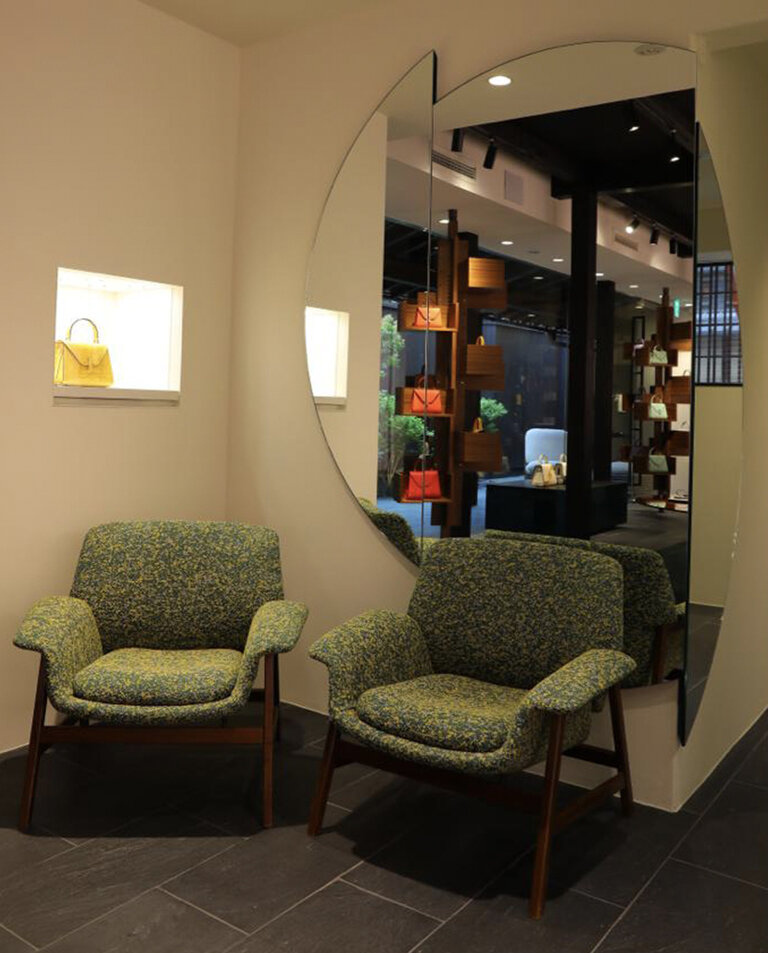 Curated by Luciano Giorgi Studio LGB - which has masterminded the space’s custom-design brass and green-lacquered mirrored furnishings as a nod to Valextra’s aesthetic handwriting, incorporating brushed and dyed hemlock wood in tribute to Japanese dark woods - the space is complemented by a new typeface conceived by Studio Temp which took inspiration from the 1962 Valextra logo created by the legendary architect and graphic designer AG Fronzoni.