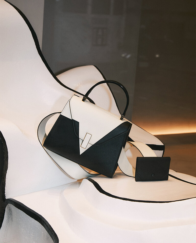 For this chapter, our black lacquered Costa edging that frames the exterior of Valextra’s leather goods and our handpainted Inchiostro lines that finesse their interior are interpreted in an abstract window installation. Featuring the Tric Trac Crossbody Nano, the Iside Intarsia V and our shoulder straps with detachable card and coin purses, it conjures our artisanal spirit and presents it in morphological form.