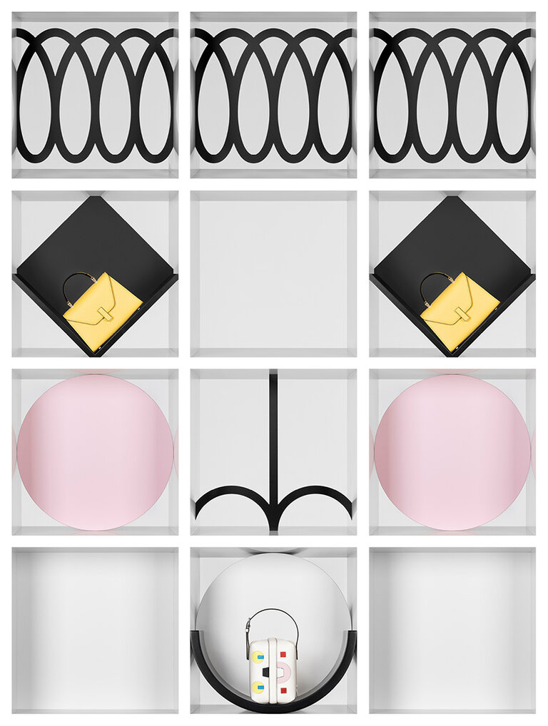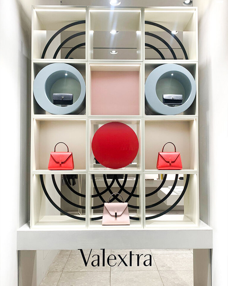 An ode to the great Milanese inventor and artist Bruno Munari, Valextra’s geometric windows have been architected to take on the appearance of abstract faces, becoming the literal and figurative eyes into our store through which brand codes are reflected and a series of leather goods entice and invite.