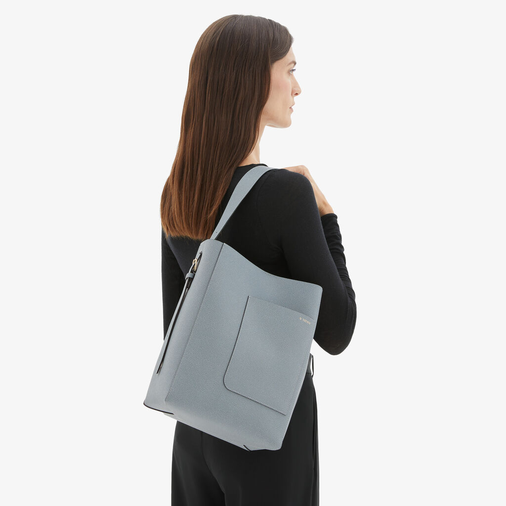 The Bucket Medium handbag defines the Valextra story of refinement. Crafted with our Millepunte leather in a niagara blue hue, it is finessed with our handpainted black lacquered Costa edging. Inside, it features a detachable leather pouch, while its small outside pocket is ideal for easy-to-reach essentials like cards. It has a metal hook closure for added security.