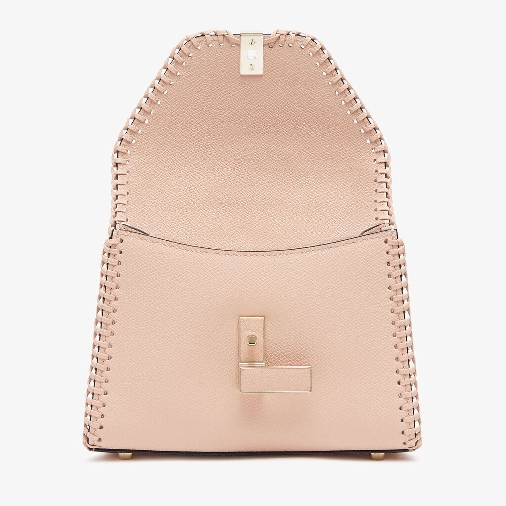 The Iside Braided Crossbody Micro handbag combines artisanal excellence with urban elegance in Bonne Mine Pink Millepunte leather. The top flap and sides have been hand-embroidered using a blanket stitch in matching leather, imbuing this Valextra icon with an artisanal sensibility. Inside, there is space for essentials only, making it an ideal size for special occasions and events. Finessed with our black lacquered Costa edging, it is a captivating reinvention of this distinctive design.
