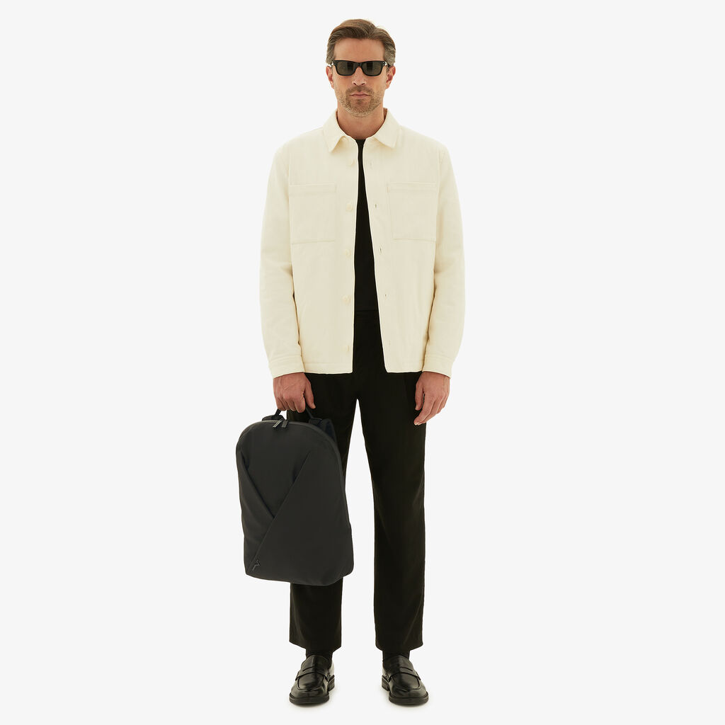 The Assoluto Backpack is an ode to modern engineering and timeless style codes. Discreet in appearance and intricate in construction, it combines Valextra’s artisanal skill with cutting-edge material innovation. Crafted from ECONYL® regenerated nylon, it is the first backpack in our new-era of bags that push the boundaries of quiet luxury. Its reinforced back panel and double backstraps have been engineered with shock-absorbing padding that makes it fit for use in both city and active situations. Inside, its spacious central chamber has space for everyday essentials as well as technology, while the two subtle external pockets – concealed on two origami-style folds – are sealed with a water-resistant zip and cater to easy-to-reach items such as wallets and cases. With our signature Millepunte leather featuring as complementary accents, this backpack becomes a new icon of quiet urban craft.