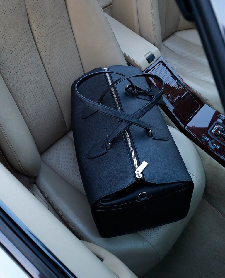 - Valextra’s signature black lacquered Costa edges are painted by hand.