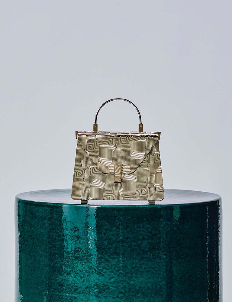 This season, our icon of urban elegance, the Iside handbag, evolves from its signature leather construction into an architectural treasure with a glossy gold-hued aluminium finish. The Iside Minaudiere has been meticulously engineered to be extremely lightweight, while its undulating surface pattern has been hand-engraved, elevating this microstructure into an artisanal masterpiece.