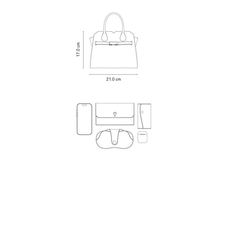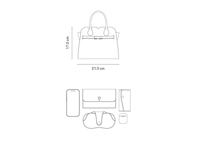 - È dotata di tracolla in pelle rimovibile e regolabile, lunga 96-106 cm.