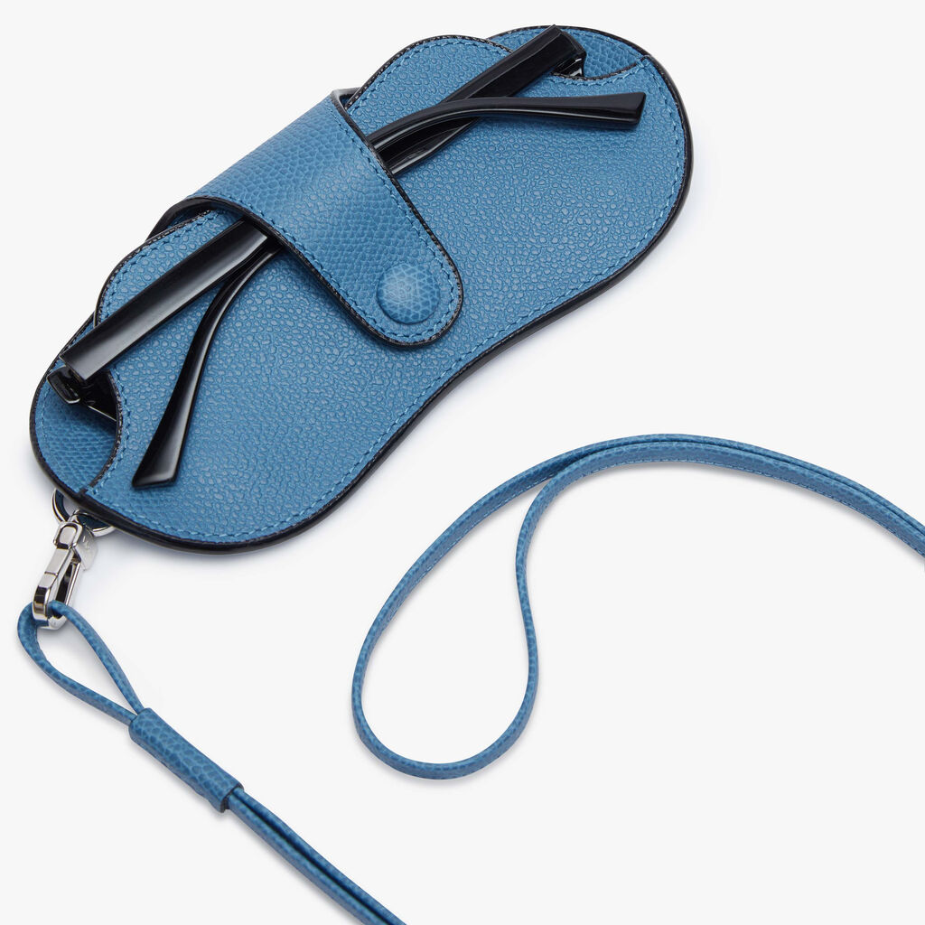 - Portaocchiali con tracolla, in pelle di vitello Millepunte nei colori Blu Nebula.